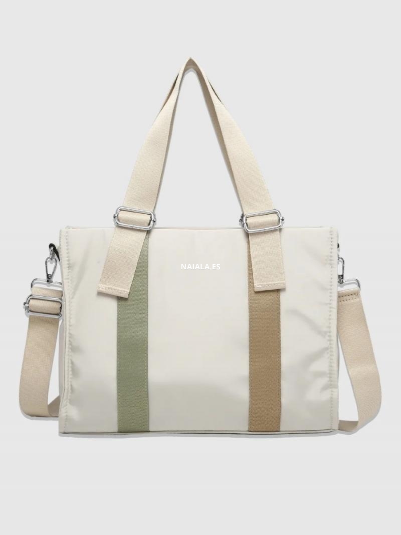 Tejido de nylon. Diseño shopper. Tamaño grande. Interior con bolsillos. Cierre de cremallera superior. Doble asa de mano. Asa larga extraíble y ajustable. Costuras visibles. Forrado.