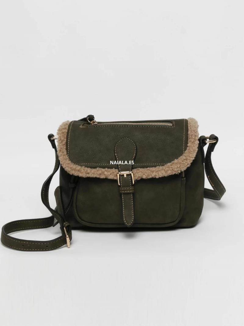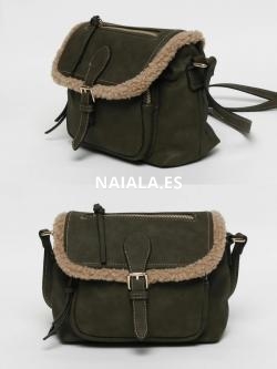 Tejido sintético. Tamaño pequeño. Cierre de cremallera superior. Cierre de solapa con botón de imán. Asa larga ajustable no extraíble. Interior con bolsillos. Bolsillo exterior. Detalle costuras de colores visibles. Detalles borreguito.