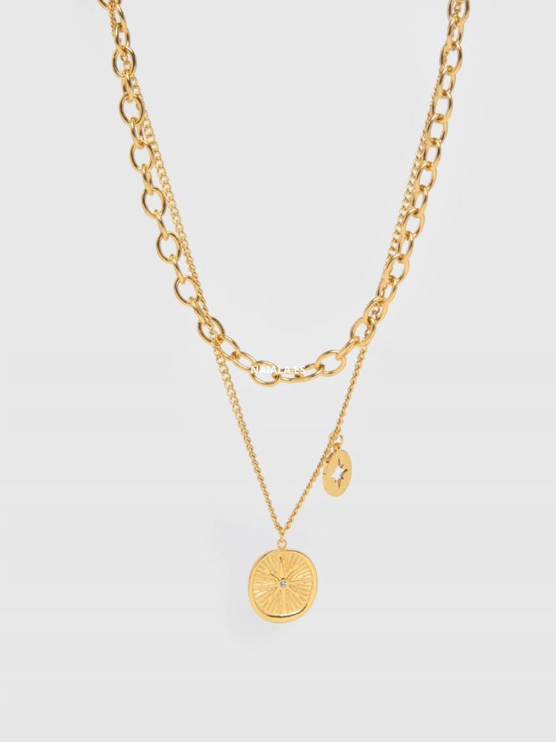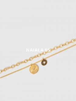 Collar fino. Diseño largo. Diseño con colgantes. Diseño doble. Cierre de cadena y gatillo. Largo ajustable.